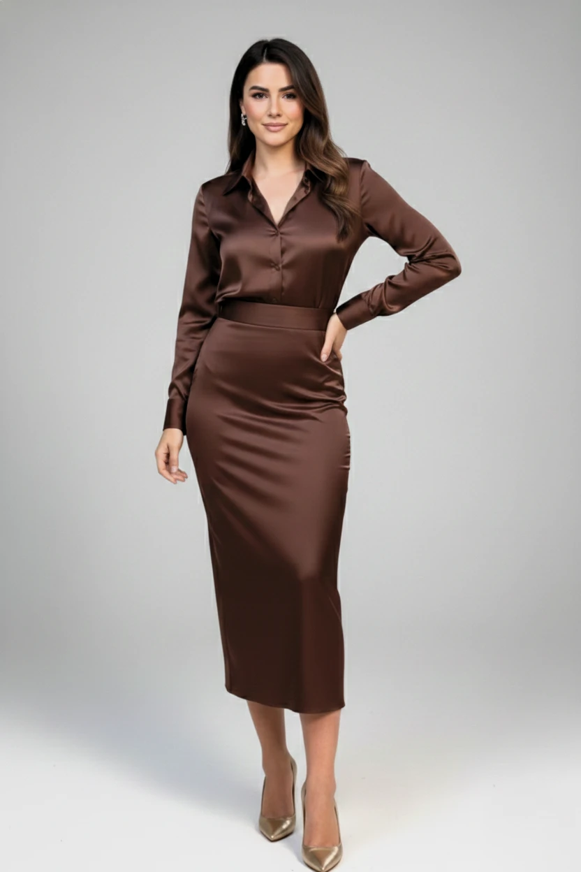 Elevate your wardrobe with this satin co-ord set, pairing a tailored shirt with a gracefully flowing skirt for a look that’s both polished and relaxed. Ideal for brunch outings, party nights, or festive occasions.