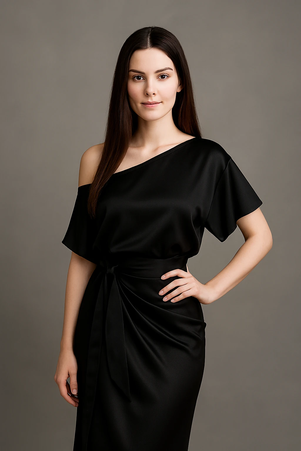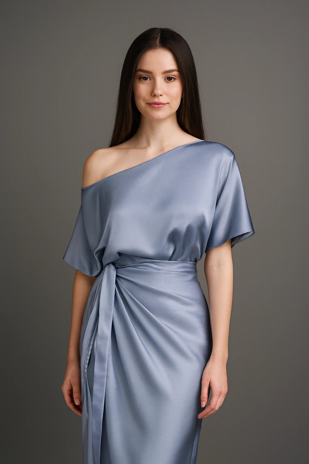Fabric: It is typically made from a satin or silk-crepe material that gives it a luxurious, liquid-like sheen and a smooth, elegant drape.
