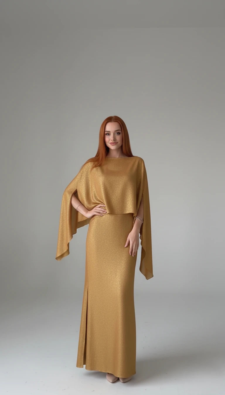 This is a full-length evening gown characterized by a flowing cape overlay that extends from the shoulders. It is typically made from lightweight fabrics like chiffon, crepe, or georgette to allow the cape to move fluidly.