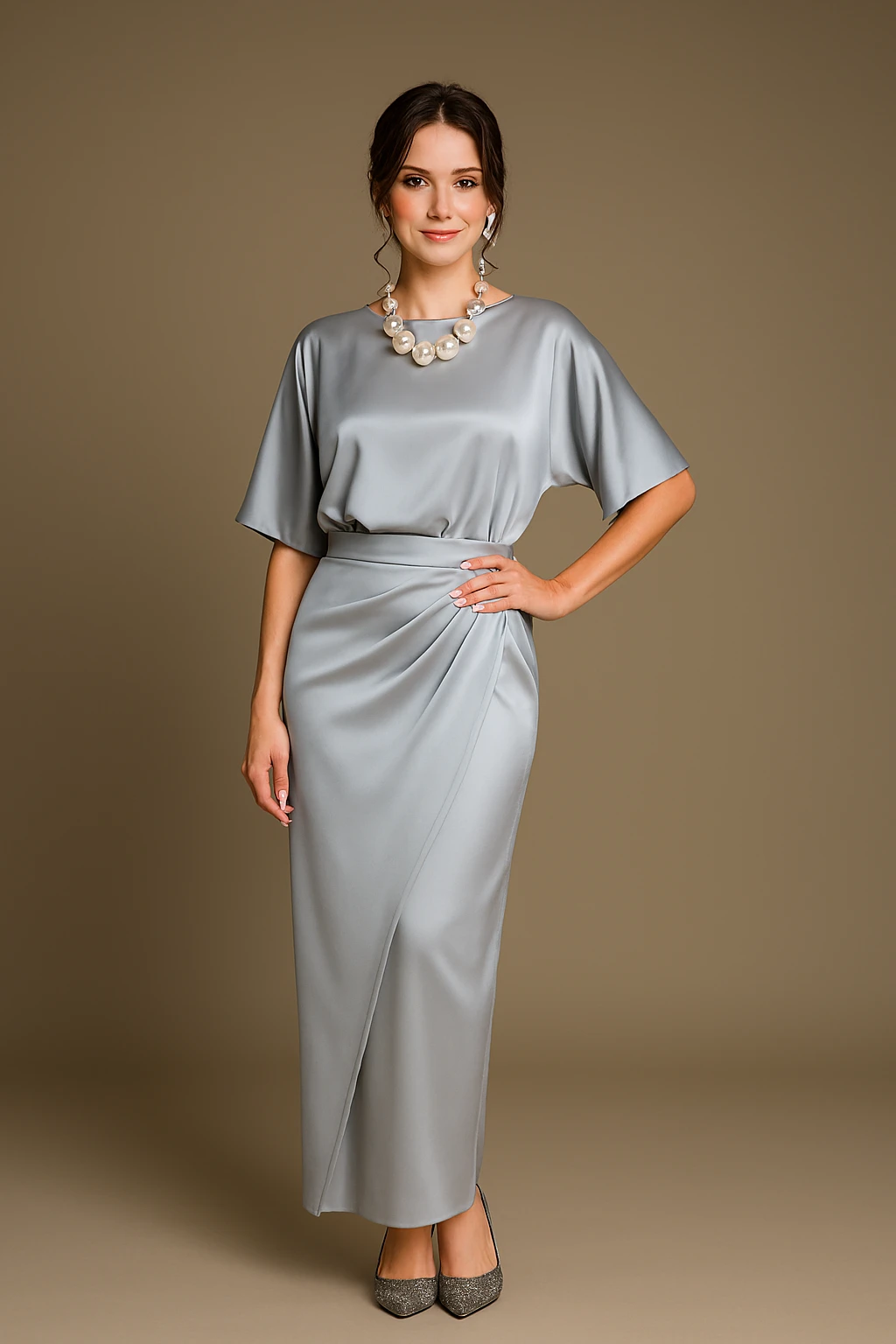 Thoughtfully crafted to blend comfort with sophistication, this outfit is ideal for festive celebrations, stylish parties, or elegant evening gatherings. The silky satin fabric delivers a radiant, luxe finish, while the wrap skirt gracefully contours the silhouette, creating a beautifully flattering and refined look.
