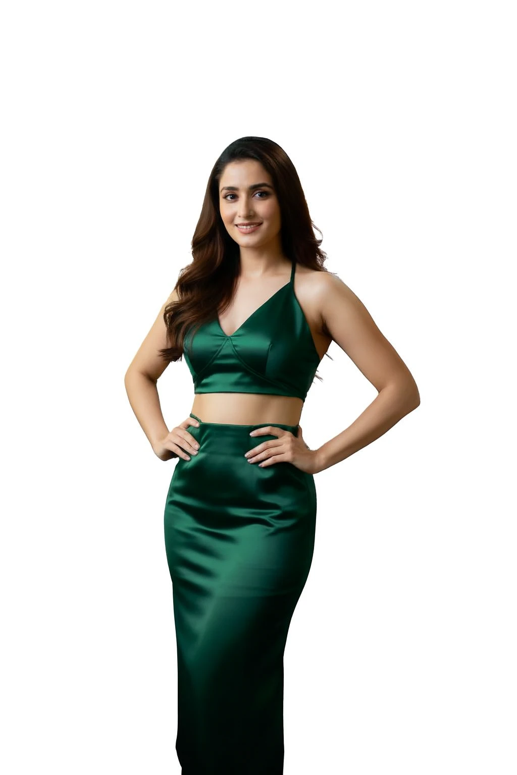 This specific look became quite popular when she wore it to a wedding party. It consists of two matching pieces: a halter-neck crop top (often with thin "strappy" details) and a matching midi skirt with a high side slit.