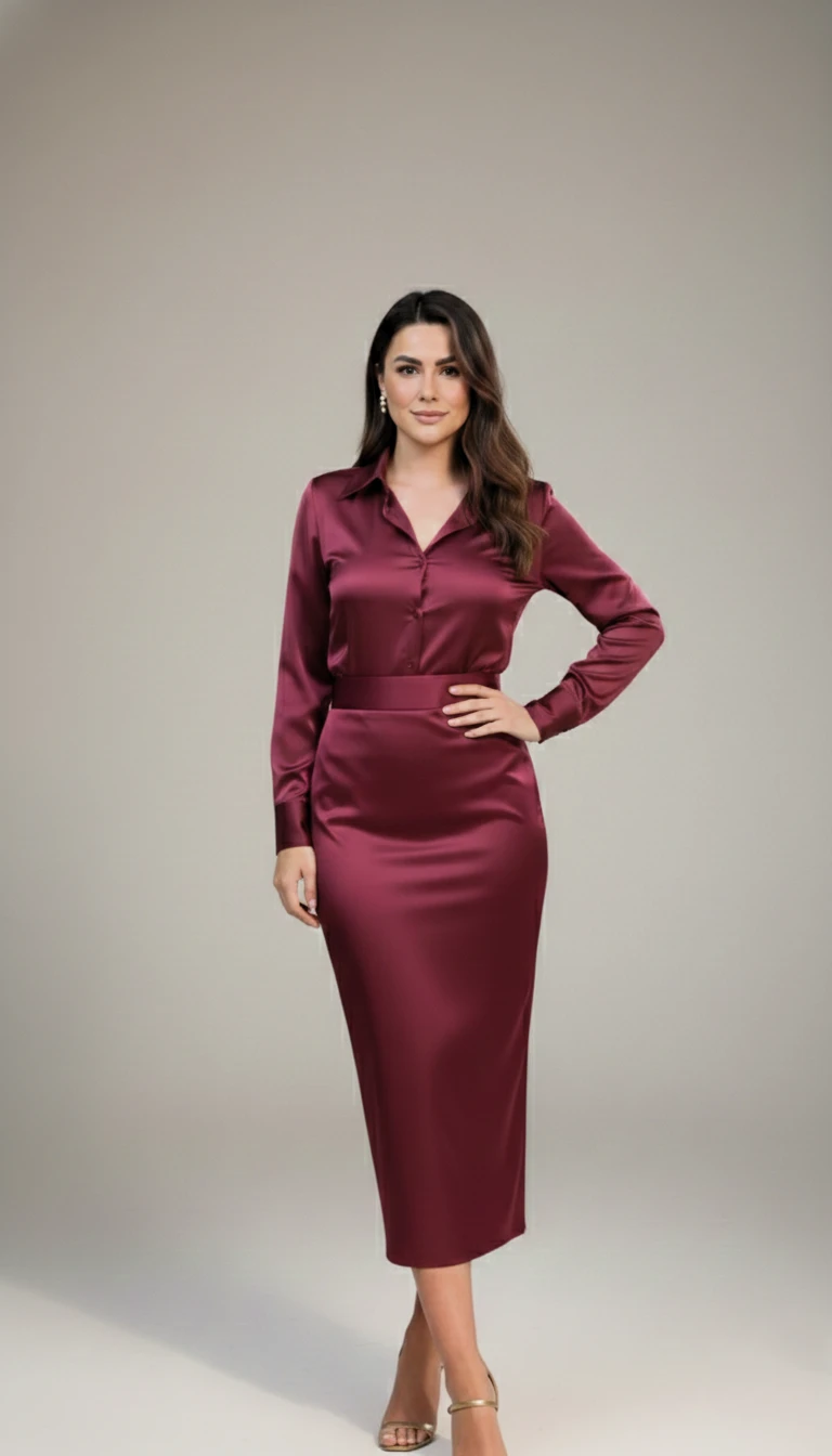 Elevate your wardrobe with this satin co-ord set, pairing a tailored shirt with a gracefully flowing skirt for a look that’s both polished and relaxed. Ideal for brunch outings, party nights, or festive occasions.