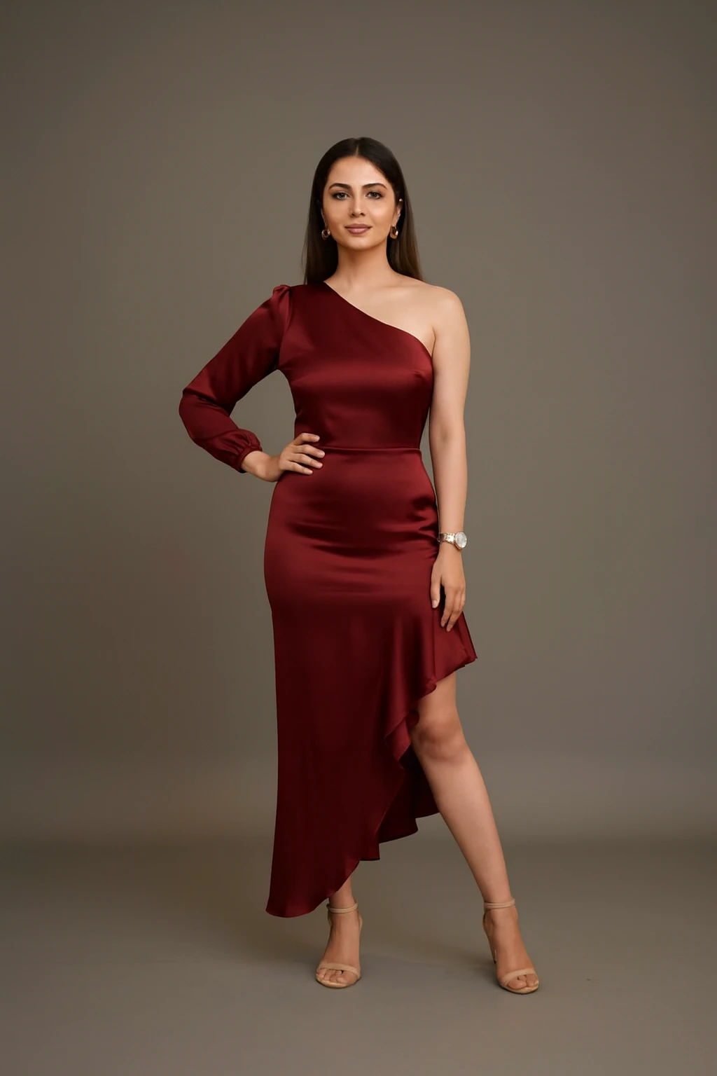 This asymmetrical dress showcases a stylish cut-out detail paired with a striking high-low hem that brings a touch of bold elegance. Ideal for parties and standout occasions where you want to make an impression.