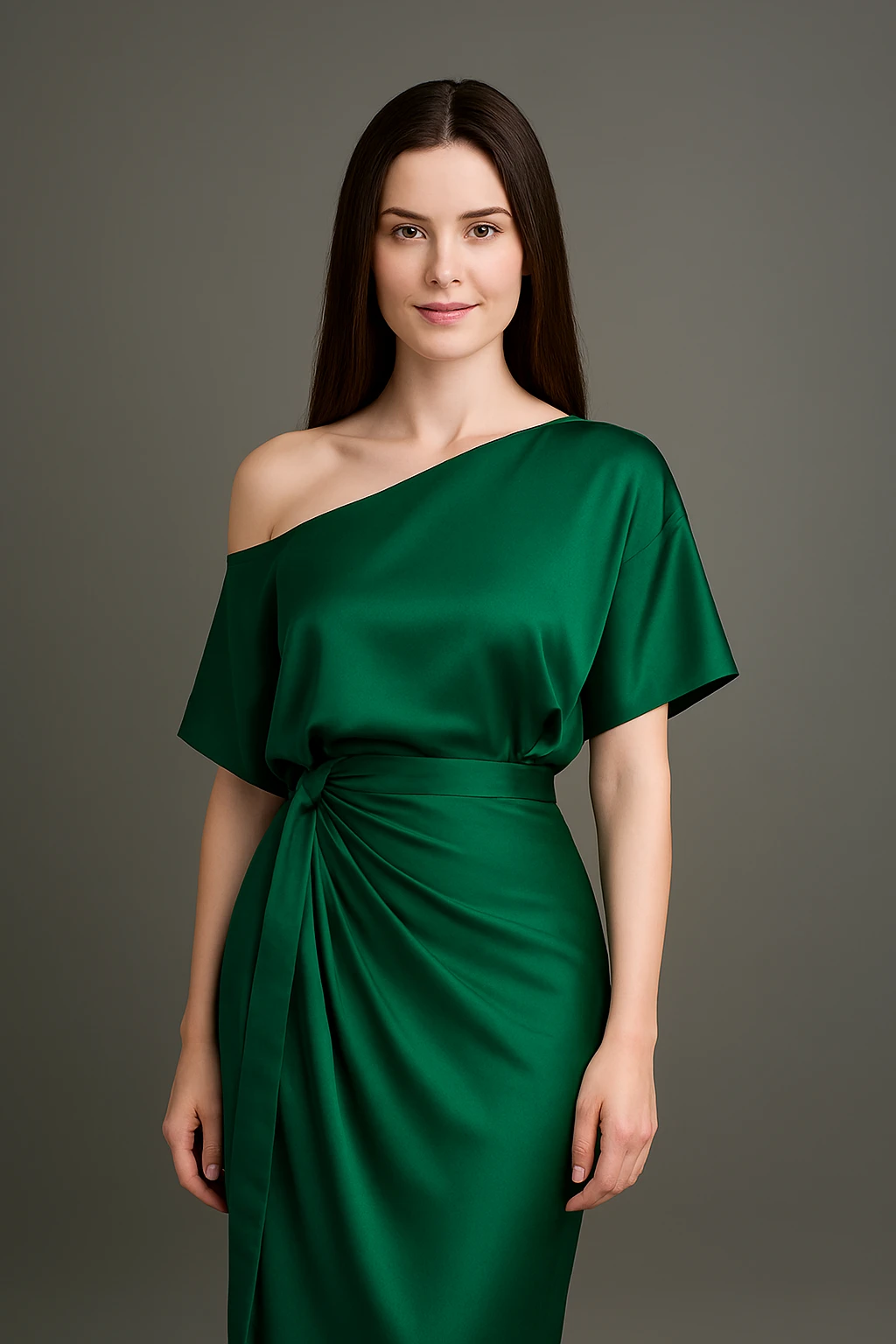 Fabric: It is typically made from a satin or silk-crepe material that gives it a luxurious, liquid-like sheen and a smooth, elegant drape.